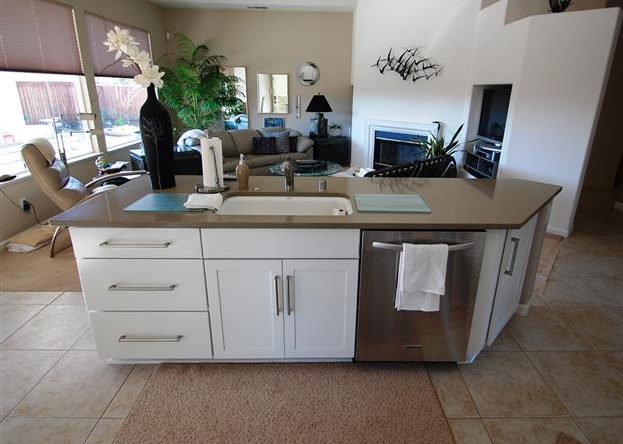 The upper cabinets are 54″ tall which really balanced out the 10′ ceilings quite well. The pantry cabinets included roll out shelves and all doors and drawers are cushion self closing. There is a custom angle cabinet we made to match the rest, to finish off the sink island to the side of the dishwasher. There was originally a solid blank panel there that held light and disposal switches. That was not only a waste of space but occasionally meant accidental flipping of those switches while working in that area. We relocated light switches to the end of the pony wall, and installed an air switch for the disposal that sits up near the sink. We removed a big tile back splash ledge from behind the sink for a nice flat quartz counter top that helped keep a more open flow into the family room.